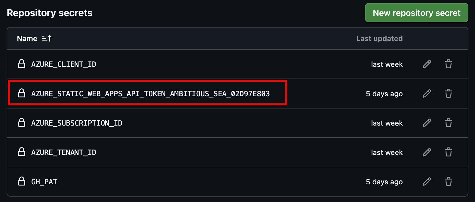 - After merging, a new workflow file and a new secret will be automatically added to your repository by Azure.